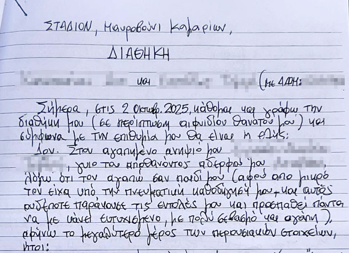 «Στον αγαπημένο μου ανιψιό….., γιο του αποθανόντος αδερφού μου…., λόγω ότι τον αγαπώ σαν παιδί μου αφού από μικρό τον είχα υπό την πνευματική μου καθοδήγηση και αυτός ουδέποτε παρανόησε τις εντολές μου και προσπαθεί πάντα να με κάνει ευτυχισμένο με πολύ σεβασμό και αγάπη, αφήνω το μεγαλύτερο μέρος των περιουσιακών στοιχείων μου» αναφέρει χαρακτηριστικά.
