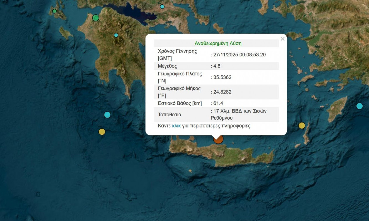Σεισμική δόνηση μεγέθους 4,8 βαθμών της κλίμακας Ρίχτερ, σύμφωνα με την αναθεωρημένη λύση Γεωδυναμικού Ινστιτούτου του Αστεροσκοπείου Αθηνών, σημειώθηκε στις 02:08 μετά τα μεσάνυχτα (Πέμπτη 27/11), σε υποθαλάσσια περιοχή του Βόρειου Κρητικού Πελάγους.