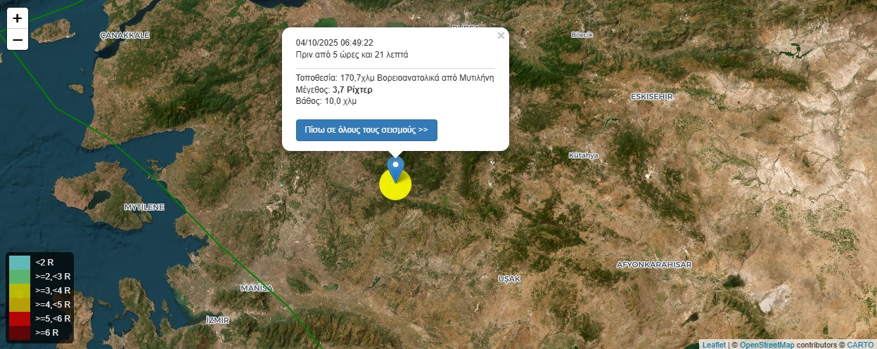 Σεισμός 3,7 Ρίχτερ 170,7χλμ Βορειοανατολικά από Μυτιλήνη στις 04/10/2025 06:49:22