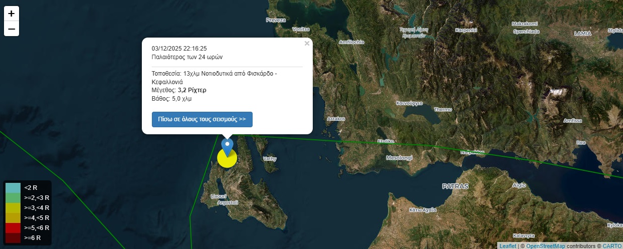 Σύμφωνα με πληροφορίες από seismos.gr, σεισμός 3,2 βαθμών της κλίμακας Ρίχτερ σημειώθηκε στις 03/12/2025 και ώρα 22:16:25, με το επίκεντρο να εντοπίζεται 13 χιλιόμετρα νοτιοδυτικά από το Φισκάρδο της Κεφαλλονιάς. Η σεισμική δόνηση είχε εστιακό βάθος 5 χιλιομέτρων, στοιχείο που κατατάσσει το φαινόμενο στους επιφανειακούς σεισμούς, οι οποίοι συνήθως γίνονται αισθητοί σε περιορισμένη ακτίνα αλλά σπάνια προκαλούν ζημιές όταν η έντασή τους παραμένει χαμηλή. Κάτοικοι σε κοντινές περιοχές ενδέχεται να αντιλήφθηκαν έναν σύντομο κραδασμό, ωστόσο δεν αναφέρθηκαν επιπτώσεις σε υποδομές ή προβλήματα στην καθημερινή δραστηριότητα.