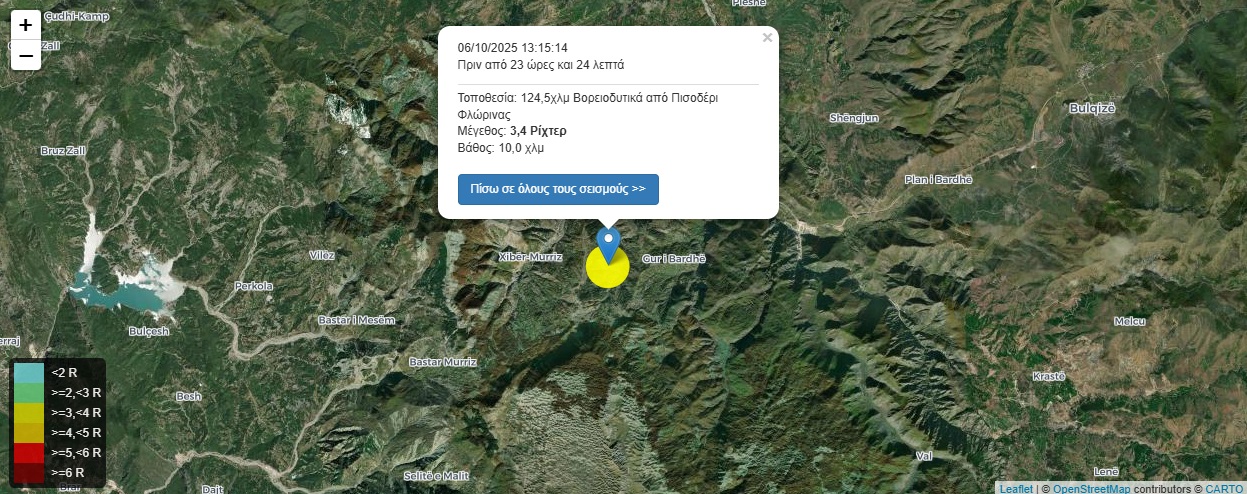 Σεισμός 3,4 Ρίχτερ 124,5χλμ Βορειοδυτικά από Πισοδέρι Φλώρινας στις 06/10/2025 13:15:14