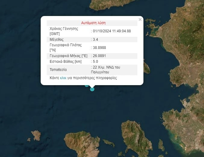 Το επίκεντρο εντοπίζεται στα 22 χιλιόμετρα ΝΝΔ του Πολυχνίτου.