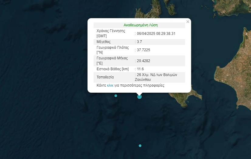 Ασθενής σεισμική δόνηση μεγέθους 3,7 Ρίχτερ καταγράφηκε το πρωί της Κυριακής 6 Απριλίου ανοιχτά της Ζακύνθου, χωρίς να προκαλέσει ιδιαίτερη ανησυχία, ωστόσο υπενθύμισε την ανάγκη επαγρύπνησης και σωστής προετοιμασίας των πολιτών απέναντι σε σεισμικά φαινόμενα.