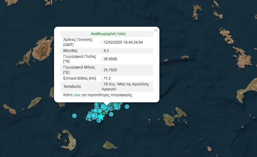 Ένας νέος σεισμός 4,2 Ρίχτερ καταγράφηκε το απόγευμα της Τετάρτης (12/02), κοντά στην Αμοργό.