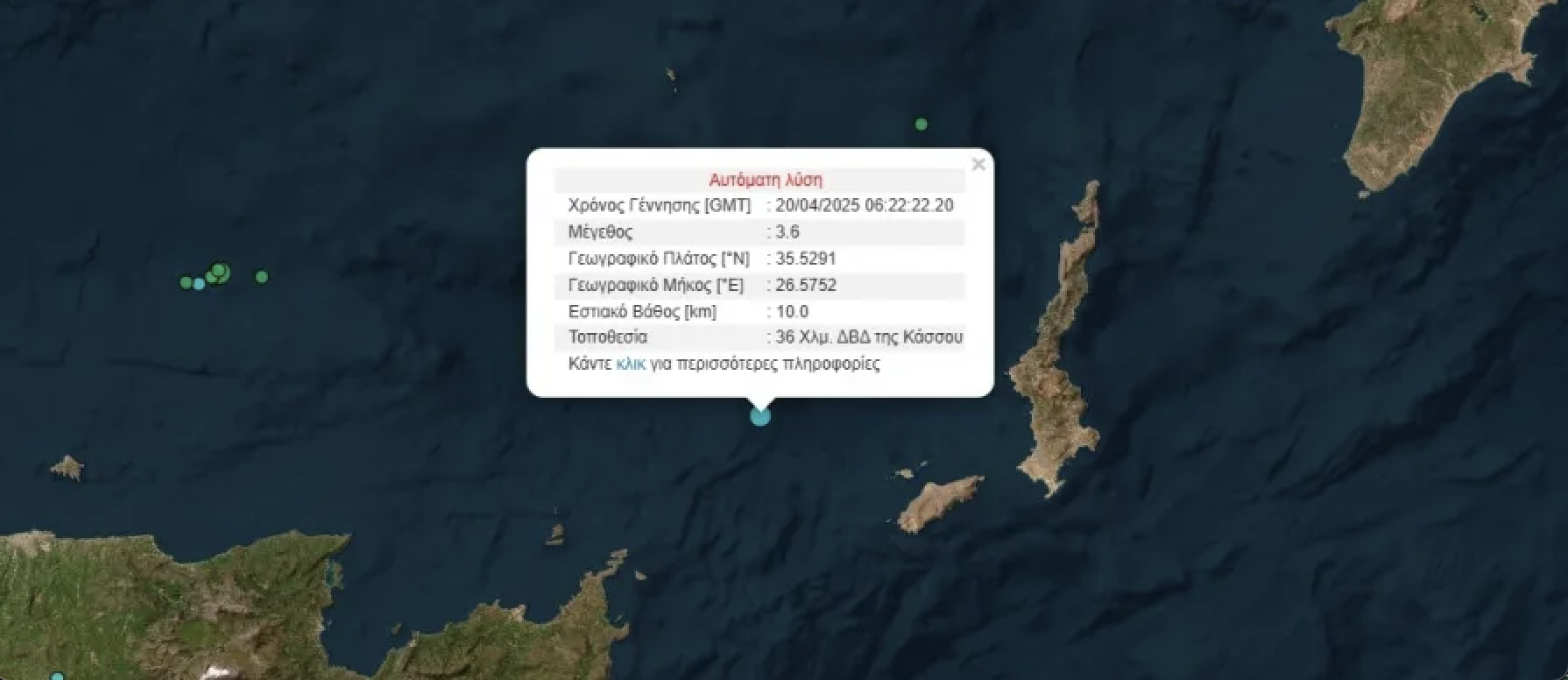 Σεισμός μεγέθους 3,6 βαθμών της κλίμακας Ρίχτερ σημειώθηκε το πρωί της Κυριακής του Πάσχα, 20 Απριλίου, στην ευρύτερη περιοχή της Κάσου, προκαλώντας αναστάτωση στους κατοίκους του νησιού.
