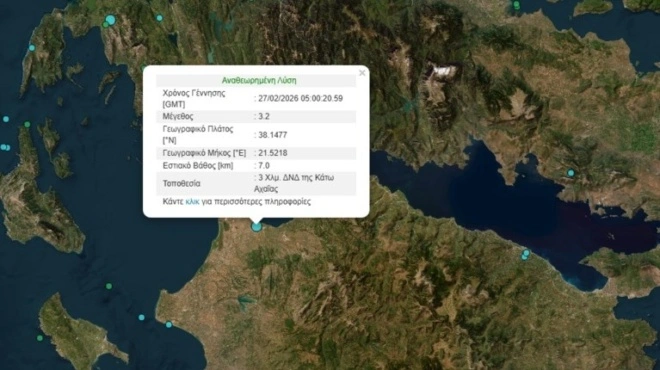 Ασθενής σεισμική δόνηση έγινε αισθητή, περίπου στις 7 το πρώι της Παρασκευής, σε περιοχές της Αχαΐας και της Ηλείας.