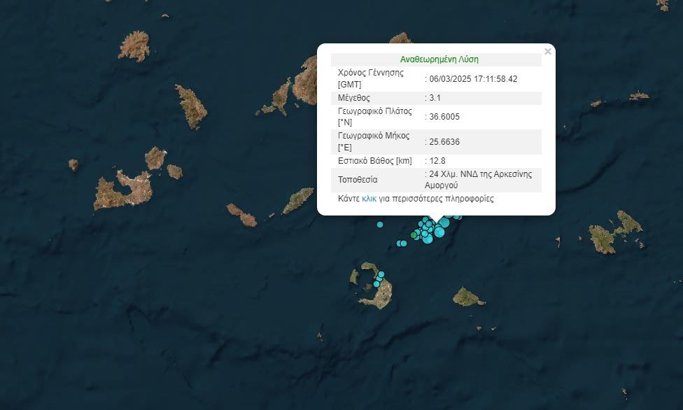 Σεισμική δόνηση 3,1 βαθμών της κλίμακας Ρίχτερ καταγράφηκε το απόγευμα της Πέμπτης 6 Μαρτίου, στις 19:11, σύμφωνα με το Γεωδυναμικό Ινστιτούτο. Ο σεισμός σημειώθηκε στη θαλάσσια περιοχή κοντά στη Σαντορίνη, χωρίς να προκληθούν ζημιές ή ανησυχία στους κατοίκους.
