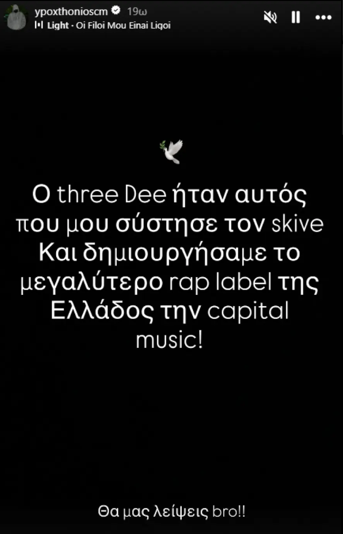 O ThreeDee είχε συνεργαστεί αρκετά και με τον Υποχθόνιο, ο οποίος στο Instagram έγραψε χθες: «Ο 3D ήταν αυτός που μου σύστησε τον Skive και δημιουργήσαμε το μεγαλύτερο rap label στην Ελλάδα, την Capital Music. Θα μας λείψεις bro».