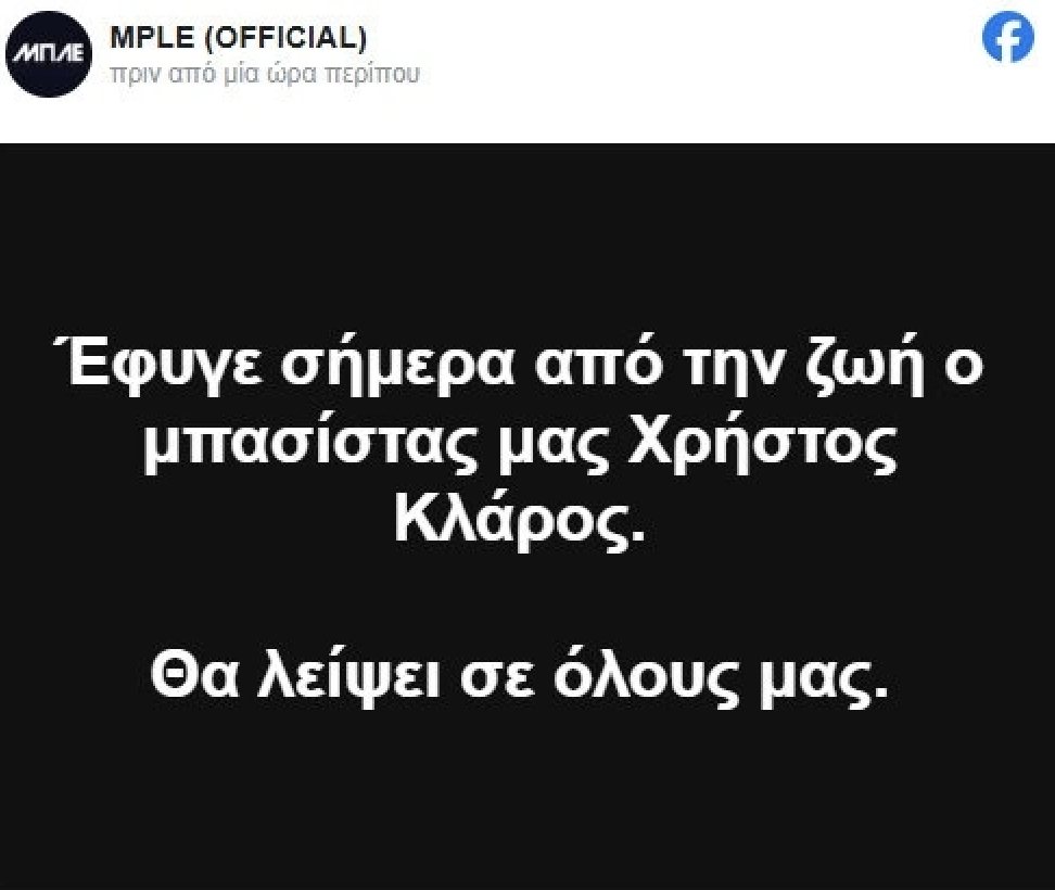 «Έφυγε σήμερα από την ζωή ο μπασίστας μας Χρήστος Κλάρος. Θα λείψει σε όλους μας», έγραψαν στην ανάρτησή τους.