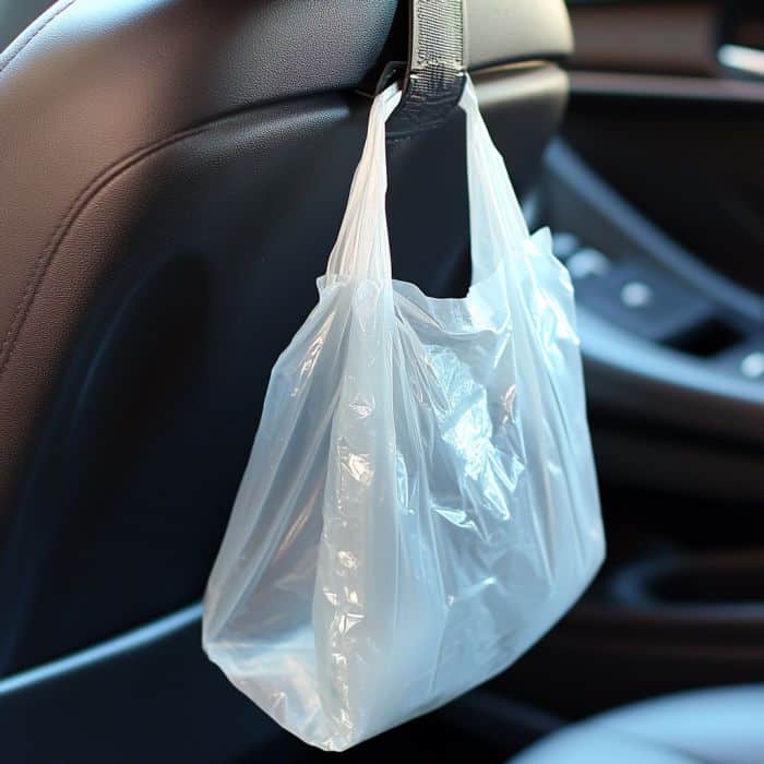 Διατηρήστε το αυτοκίνητό σας τακτοποιημένο χρησιμοποιώντας μια πλαστική σακούλα ως κάδο απορριμμάτων. Κρεμάστε το από την πλάτη ενός καθίσματος ή τοποθετήστε το σε ένα βολικό σημείο για εύκολη πρόσβαση. Αυτό το κόλπο βοηθά στη διατήρηση ενός καθαρού εσωτερικού χώρου οχήματος χωρίς την ανάγκη ειδικού κάδου απορριμμάτων αυτοκινήτου.