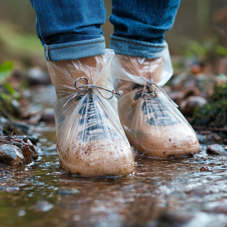 Οι πλαστικές σακούλες μπορούν να χρησιμοποιηθούν ως αυτοσχέδια αδιάβροχα καλύμματα παπουτσιών. Απλώς βάλτε μια σακούλα σε κάθε παπούτσι και δέστε τις λαβές γύρω από τους αστραγάλους σας. Αυτό το κόλπο είναι ιδανικό για την προστασία των παπουτσιών από τη βροχή ή τη λάσπη, ειδικά κατά τη διάρκεια δραστηριοτήτων σε εξωτερικούς χώρους.