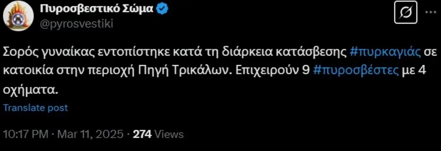«Σορός γυναίκας εντοπίστηκε κατά τη διάρκεια κατάσβεσης #πυρκαγιάς σε κατοικία στην περιοχή Πηγή Τρικάλων. Επιχειρούν 9 #πυροσβέστες με 4 οχήματα».