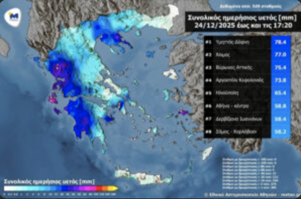 Οι περιοχές που δέχθηκαν το μεγαλύτερο όγκο νερού εντοπίζονται κυρίως κοντά στον Υμηττό, όπως η Δάφνη, ο Βύρωνας και ο Άλιμος, όπου καταγράφηκαν τα υψηλότερα επίπεδα βροχόπτωσης σε ολόκληρη τη χώρα.