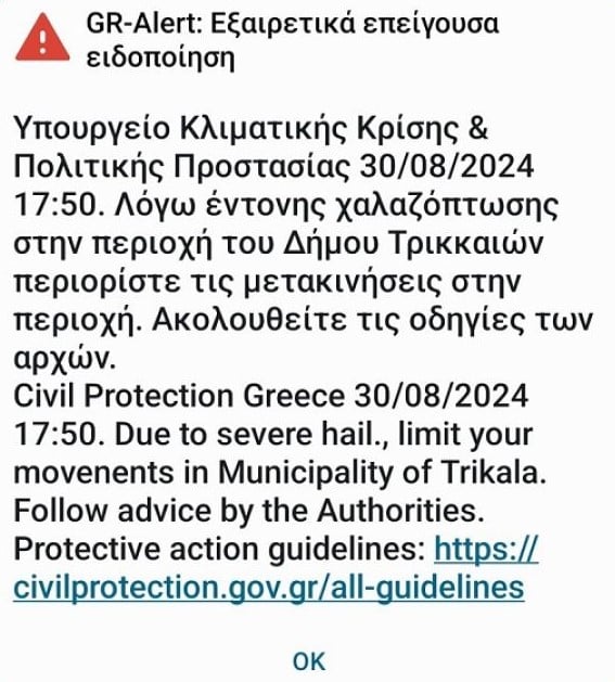 Λίγο πριν τις 6 το απόγευμα, η Πολιτική Προστασία έθεσε σε λειτουργία το σύστημα ειδοποίησης έκτακτης ανάγκης 112, στέλνοντας προειδοποιητικό μήνυμα στους κατοίκους των Τρικάλων. Στο μήνυμα αυτό, οι πολίτες καλούνται να περιορίσουν τις μετακινήσεις τους για λόγους ασφαλείας.