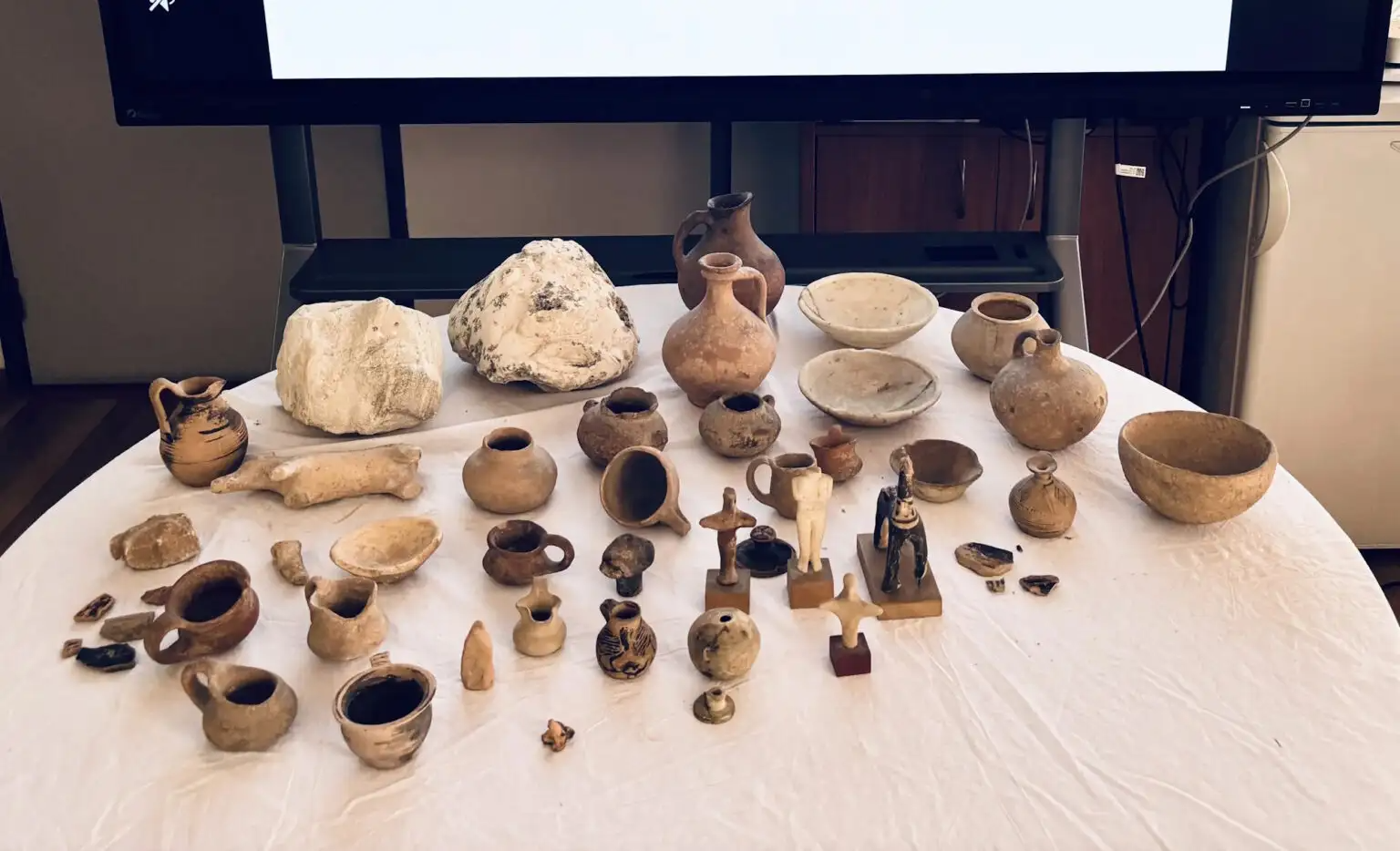 Στο σπίτι του άνδρα βρέθηκαν και κατασχέθηκαν 39 αρχαία και πιθανώς αρχαία αντικείμενα, όπως μαρμάρινες και πήλινες φιάλες και κεφαλές, πυξίδες, ειδώλια, κύπελλα, αμφορέας, αγγείο, αρύβαλλος, οινοχόη, κυάθια, όστρακα, τμήμα λίθου, καθώς και 1 φιάλη με υγρό και ανθρώπινο έμβρυο.