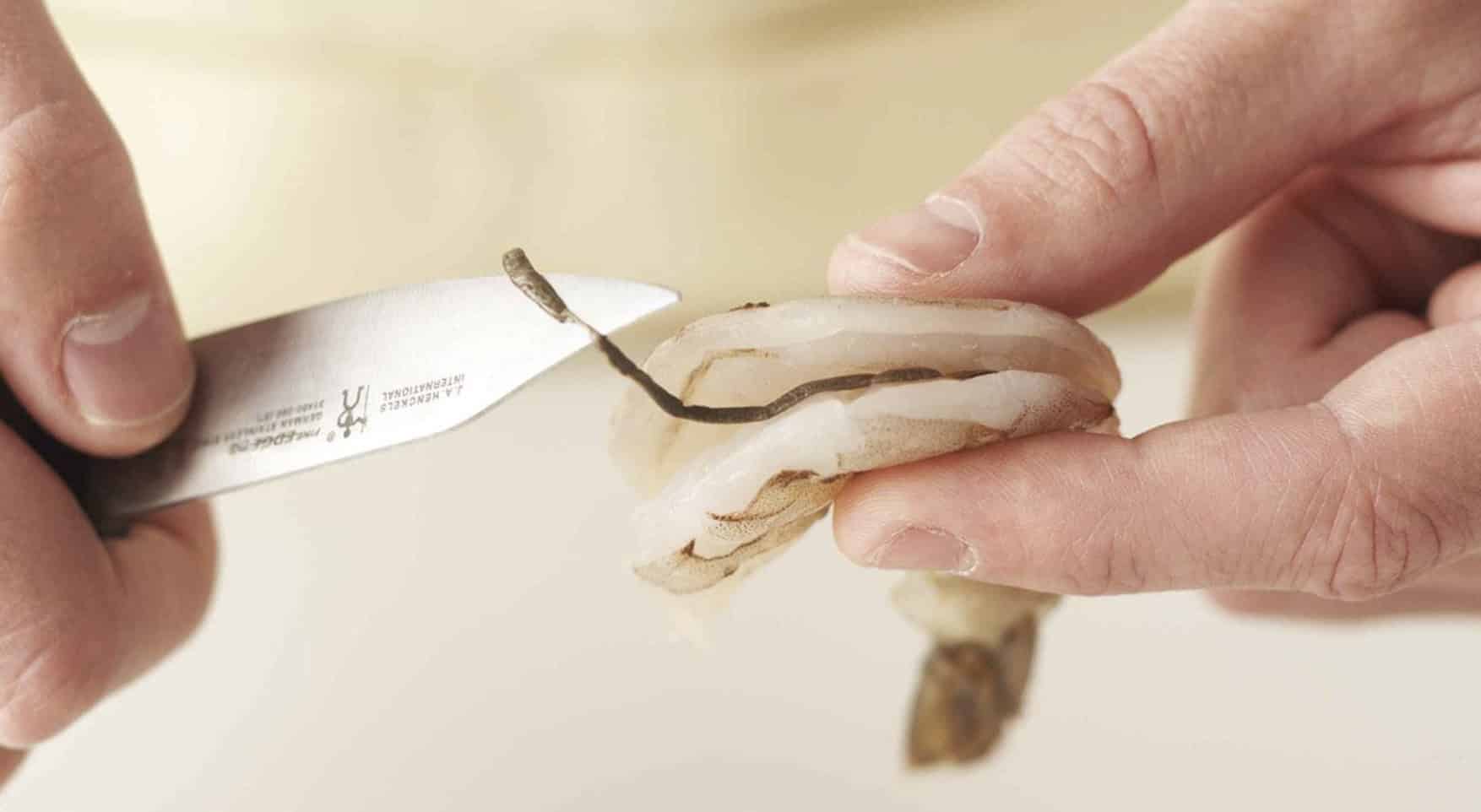 - Σε ωμές γαρίδες, κάντε μια ρηχή τομή κατά μήκος της πλάτης και σηκώστε απαλά τη «φλέβα» με την άκρη ενός μαχαιριού ή με μια οδοντογλυφίδα.