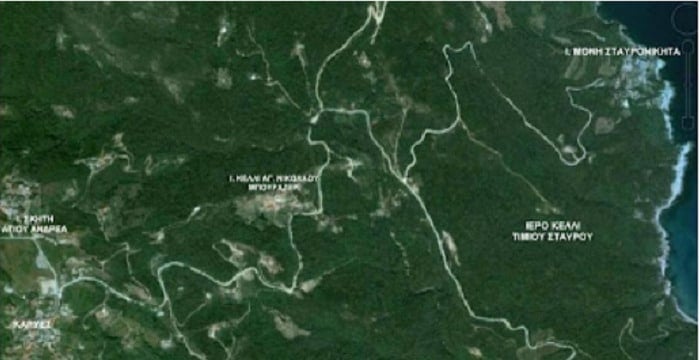 Στην διαδρομή από Σταυρονικήτα προς Καρυές, λίγο μετά το προσκυνητάρι από τα αριστερά του δρόμου, ξεκινά ένα μονοπάτι.