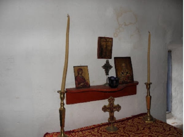 Εντυπωσιακή απλότητα. Λίγα μέτρα δυτικότερα από την είσοδο άλλη εξωτερική πόρτα οδηγούσε στο εργαστήριο του και στο Αρχονταρίκι. ένα μικρό, φτωχό κελλάκι με χαμηλό ταβάνι από καλάμια και χώμα, και με δυο πολύ στενά κρεβάτια, που μεταξύ τους απείχαν ελάχιστα, μόλις χωρούσε να σταθεί ένας άνθρωπος.