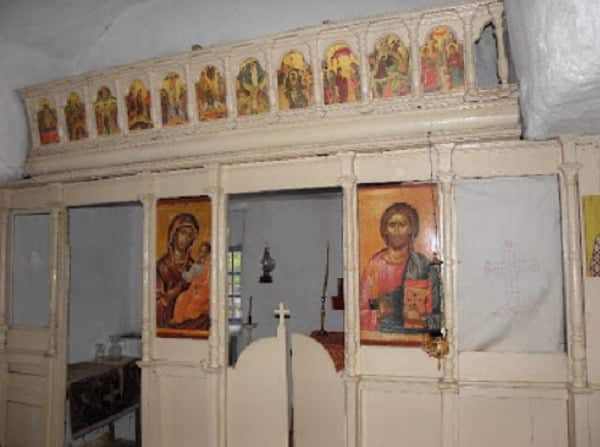 Αριστερά ήταν ένα πρωτόγονο μαγειρείο, μια θέση στο πεζούλι, όσο να χωρά η κατσαρόλα, και από κάτω ένας χώρος για ν’ ανάβει φωτιά. Υπήρχε μικρό υπόστεγο πρίν από την είσοδο της Καλύβης και ο προσκυνητής, περνώντας την θύρα της εισόδου, βρισκόταν σε έναν προθάλαμο με ένα βήμα πλάτος και τρία μήκος, πού φωτιζόταν από ένα παραθυράκι. Κατ’ ευθείαν εμπρός ήταν το κελλί του Γέροντα και αριστερά το Εκκλησάκι του Τιμίου Σταυρού με τρεις-τέσσερις εικόνες στο τέμπλο, ένα στασίδι, ένα αναλόγιο και τίποτε άλλο.