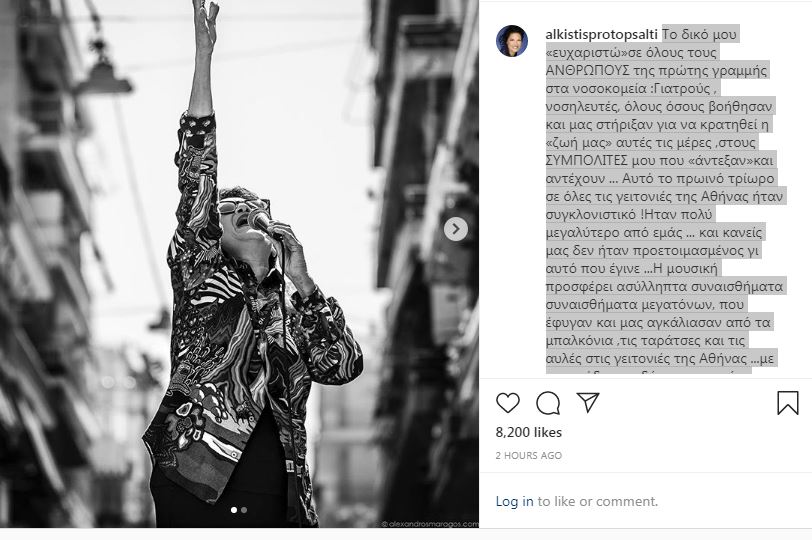 Μήνυμα σε πολλαπλούς αποδέκτες έστειλε, μέσω Instagram, η Άλκηστις Πρωτοψάλτη για τη χθεσινή εν κινήσει συναυλία της.