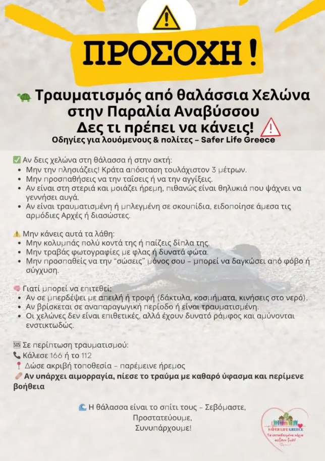 Επίθεση σε λουόμενη πραγματοποίησε θαλάσσια χελώνα, σε παραλία της Αναβύσσου το απόγευμα της Κυριακής, με συνέπεια να την τραυματίσει σοβαρά σε δάχτυλο του ποδιού της.