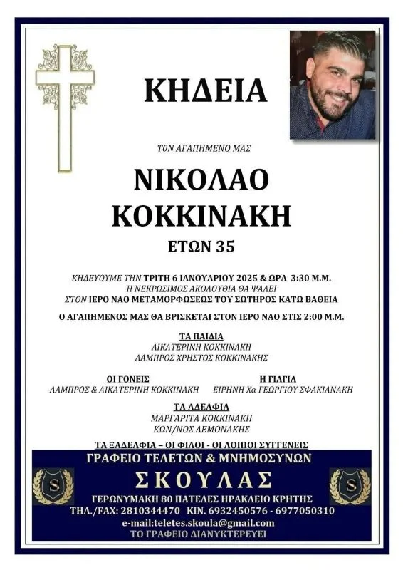 Πένθος επικρατεί στην Ανώπολη του δήμου Χερσονήσου για τον χαμό του 35χρονου Νίκου Κοκκινάκη που «έσβησε» μέσα στο σπίτι του.