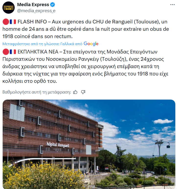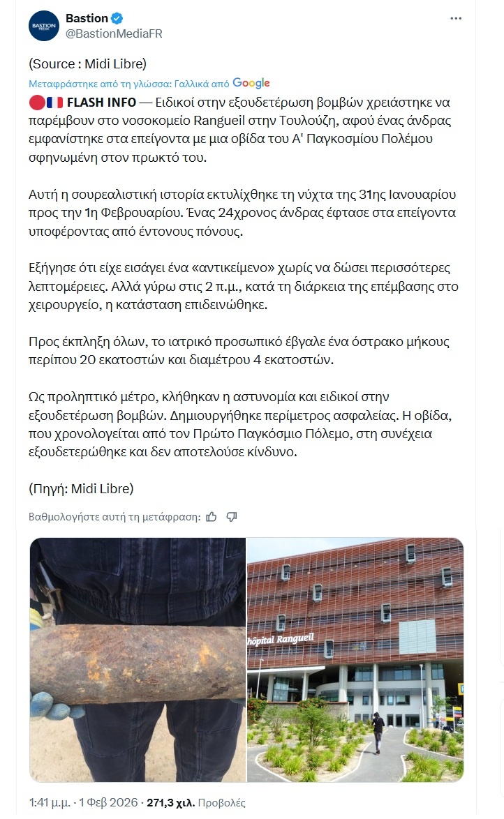 Ένα απίστευτο περιστατικό συνέβη στη Γαλλία, όταν ένας νεαρός άνδρας μεταφέρθηκε στο νοσοκομείο με ένα βλήμα του Α’ Παγκοσμίου Πολέμου… μέσα του, προκαλώντας πανικό, εκκένωση και κινητοποίηση πυροτεχνουργών.