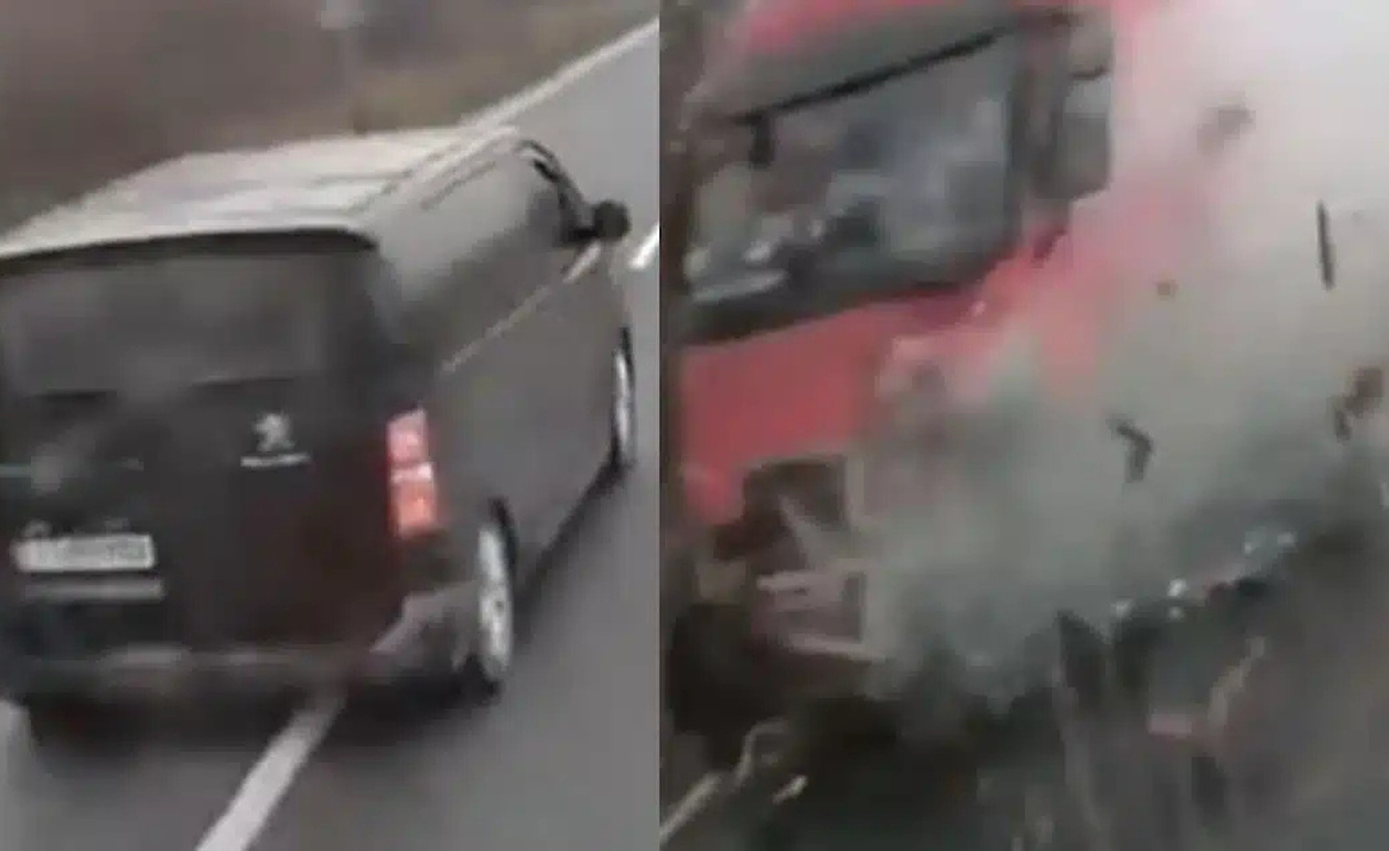 Ως αποτέλεσμα, το μίνι βαν εκτράπηκε εκ νέου προς την αριστερή λωρίδα, εισερχόμενο στο αντίθετο ρεύμα κυκλοφορίας. Η εξέλιξη αυτή αποδείχθηκε μοιραία, καθώς ακολούθησε μετωπική, έκκεντρη σύγκρουση με τη νταλίκα που κινούνταν κανονικά από την αντίθετη κατεύθυνση. Ο πραγματογνώμονας που εξετάζει το υλικό σημειώνει ότι η πρωτογενής επαφή πραγματοποιήθηκε στο εμπρόσθιο αριστερό τμήμα του βαρέος οχήματος, στοιχείο που φαίνεται να καθόρισε τη σφοδρότητα της σύγκρουσης.