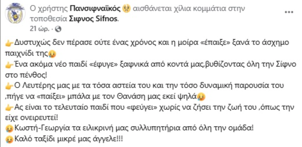 Ο Πανσιφναϊκός, με συγκίνηση, αποχαιρέτησε τον 14χρονο με μία ανακοίνωση: «Δυστυχώς, δεν πέρασε ούτε ένας χρόνος και η μοίρα ”έπαιξε” ξανά το άσχημο παιχνίδι της. Ένα ακόμα νέο παιδί ”έφυγε” ξαφνικά από κοντά μας, βυθίζοντας όλη την Σίφνο στο πένθος! Ο Λευτέρης μας, με τα τόσα αστεία του και την δυναμική του παρουσία, πήγε να ”παίξει” μπάλα με τον Θανάση μας εκεί ψηλά. Ας είναι το τελευταίο παιδί που ”φεύγει” χωρίς να ζήσει τη ζωή του όπως την είχε ονειρευτεί! Κωστή-Γεωργία τα ειλικρινή μας συλλυπητήρια από όλη την ομάδα! Καλό ταξίδι μικρέ μας άγγελε!!!».