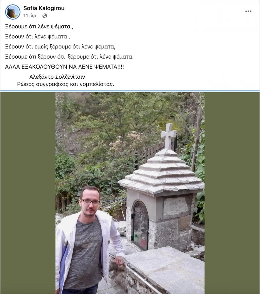 Η κ. Καλογήρου, πρώην προϊσταμένη της Εισαγγελίας Εφετών Λάρισας, ανέβασε στον προσωπικό της λογαριασμό στο Facebook ένα απόσπασμα του Ρώσου συγγραφέα και νομπελίστα Αλεξάντρ Σολζενίτσιν.