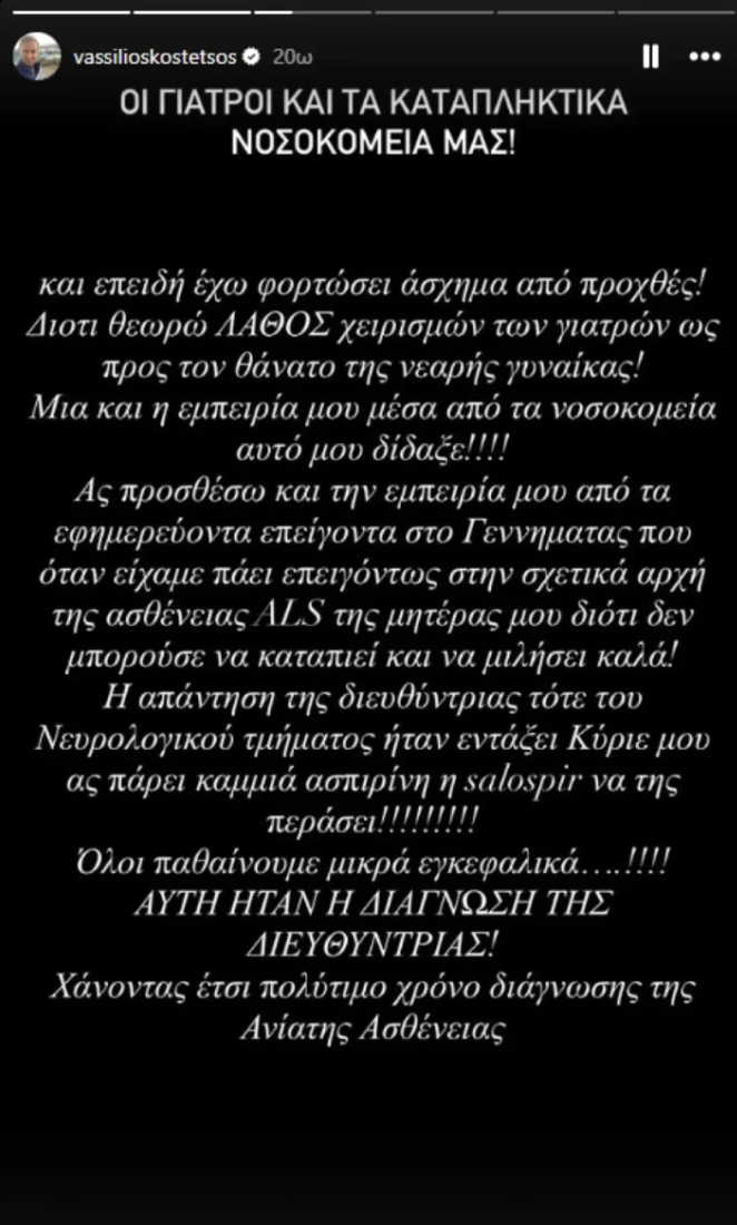«Οι γιατροί και τα καταπληκτικά νοσοκομεία μας! Και επειδή έχω φορτώσει άσχημα από προχθές, διότι θεωρώ λάθος χειρισμό των γιατρών ως προς τον θάνατο της νεαρής γυναίκας, μια και η εμπειρία μου μέσα από τα νοσοκομεία αυτό μου δίδαξε!!! Ας προσθέσω και την εμπειρία μου από το εφημερεύοντα επείγοντα στο Γεννηματάς που όταν είχαμε πάει επειγόντως στην σχετικά αρχή της ασθένειας ALS της μητέρας μου διότι δεν μπορούσε να καταπιεί και να μιλήσει καλά, η απάντηση της διευθύντριας τότε του νευρολογικού τμήματος ήταν “εντάξει κύριέ μου, ας πάρει καμία ασπιρίνη ή salospir να της περάσει!!!! Όλοι παθαίνουμε μικρά εγκεφαλικά… !!!!!”. Αυτή ήταν η διάγνωση της διευθύντριας! Χάνοντας έτσι πολύτιμο χρόνο διάγνωσης της ανίατης ασθένειας», έγραψε χαρακτηριστικά.