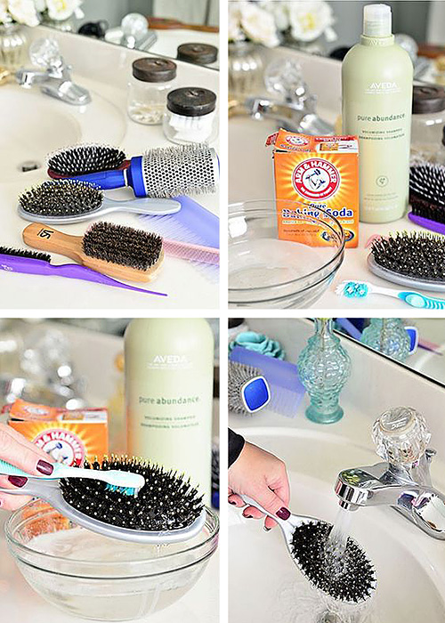 Γεμίστε ένα μπολ μέχρι τη μέση με ζεστό νερό, ρίξτε ένα κουταλάκι του γλυκού σαμπουάν και αντίστοιχη ποσότητα σόδας και αναμίξτε με την οδοντόβουρτσα. Μετά, «βουτήξτε» μέσα στο μίγμα τη βούρτσα των μαλλιών για να μαλακώσει και αρχίστε να τρίβετε με την οδοντόβουρτσα. Στο τέλος, ξεπλύνετε με νερό για ν΄ απομακρυνθούν τα υπολείμματα του μίγματος. Αφήστε τη βούρτσα να στεγνώσει και μετά θα είναι σαν καινούρια.
