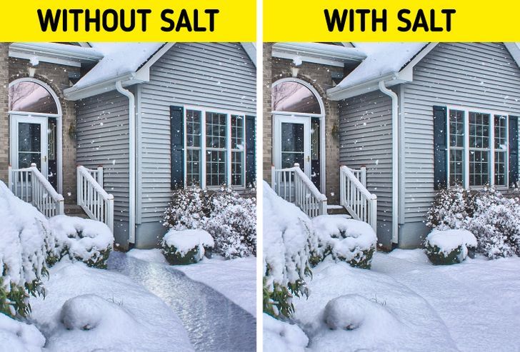 – Αποτρέψτε το χιόνι να μετατραπεί σε πάγο: Εάν ζείτε σε ένα μέρος όπου το χιόνι είναι σύνηθες, ρίξτε χούφτες αλάτι στο χιόνι που έχει συσσωρευτεί ώστε να αποτρέψει το σχηματισμό πάγου. Αυτό συμβαίνει επειδή το αλάτι μειώνει το σημείο πήξης του νερού. Σε κανονικές συνθήκες, αυτό το σημείο είναι 4 ° C, αλλά με αυτό το τέχνασμα μπορεί να φτάσει στους -10 ° C, -15° C ή ακόμα και στους -20° C, ανάλογα με την ποσότητα του αλατιού που χρησιμοποιείτε και την ποσότητα του χιονιού που έχει πέσει.