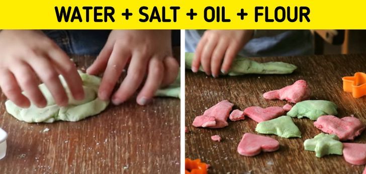 – Φτιάξτε σπιτική πλαστελίνη: Χρειάζεστε αλεύρι, αλάτι, λάδι και νερό. Οι ποσότητες έχουν ως εξής: 3 φλιτζάνια αλεύρι, ένα φλιτζάνι λεπτό αλάτι, ένα φλιτζάνι νερό σε θερμοκρασία δωματίου, 2 με 5 κουταλιές λάδι, και αν θέλετε χρώμα, χρωστική τροφίμων. Η διαδικασία είναι απλή: βάλτε τα πάντα μαζί (εκτός από την χρωστική) σε ένα μπολ και ζυμώστε. Αν δείτε ότι η ζύμη που προκύπτει είναι πολύ σκληρή, προσθέστε μπορείτε να προσθέσετε νερό μέχρι να έχετε την ιδανική συνοχή. Εάν είναι πολύ υγρό, απλά πρέπει να προσθέσετε περισσότερο αλεύρι.