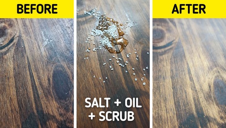 – Καθαρίστε τους λεκέδες σε ξύλο: Ο χρόνος και οι κοινωνικές συγκεντρώσεις στο σπίτι αφήνουν τα δικά τους σημάδια στα έπιπλα σας και μερικές φορές είναι δύσκολο να αφαιρεθούν. Βάλτε λίγο αλάτι και λάδι πάνω του, και με τη βοήθεια ενός υφάσματος, τρίψτε το για λίγα λεπτά. Στη συνέχεια σκουπίστε ξανά την επιφάνεια με ένα υγρό πανί, στεγνώστε και τα ξύλινα έπιπλα θα φαίνονται σαν καινούργια. .
