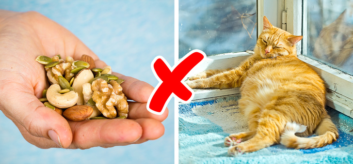 Οι ξηροί καρποί είναι πολύ υψηλοί σε λιπαρά και μπορούν να κάνουν τις γάτες μας να πάρουν βάρος εύκολα. Ενώ τα καρύδια περιέχουν πρωτεΐνες και λιπαρά που είναι υγιή για μας τους ανθρώπους, οι γάτες δεν μπορούν να τα αφομοιώσουν εύκολα. Το υψηλό επίπεδο λιπαρών μπορεί επίσης να οδηγήσει σε προβλήματα στομάχου που μπορεί να προκαλέσουν εμετό.