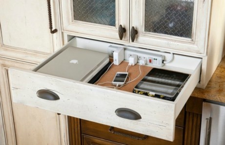 Κρύψτε τους φορτιστές σας μέσα σε ένα συρτάρι φτιάχνοντας μια όμορφη κατασκευή ώστε να φορτίζετε τα κινητά και τα τάμπλετ σας χωρίς αυτά να είναι σε κοινή θέα. Βάλτε το πολύπριζο μέσα στο συρτάρι και βγάλτε το καλώδιο από την πίσω μεριά κάνοντας μια μικρή τρύπα.