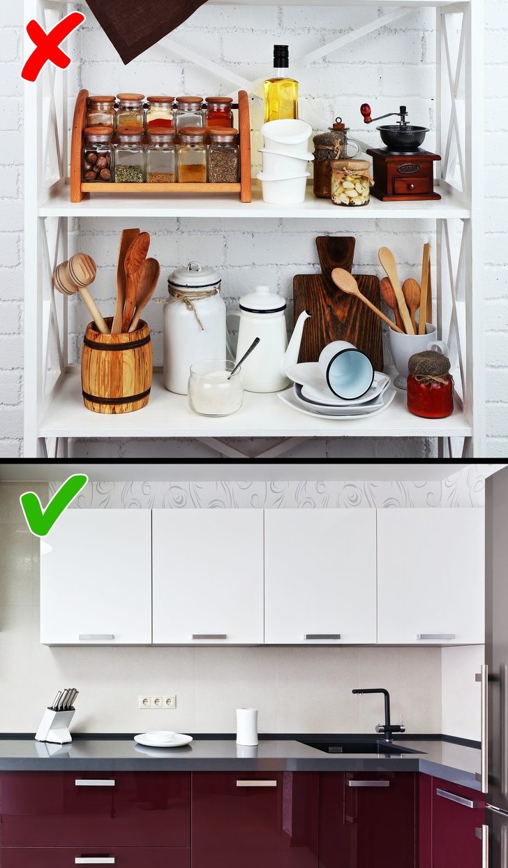 Αυτά τα ράφια χρειάζονται συνεχή καθαρισμό αλλιώς γεμίζουν σκόνη. Άλλο ένα πρόβλημα είναι πως συνεχώς θα πρέπει να τα τακτοποιείτε για να μην φαίνεται ακατάστατη η κουζίνα. Η καλύτερη λύση είναι τα κλειστά ντουλάπια.