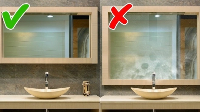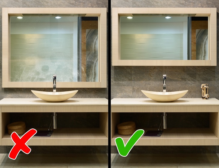 Αυτός ο καθρέφτης θα γεμίζει συνέχεια με λεκέδες από νερό. Και δεν είναι εύκολο να τον καθαρίζεις κάθε μέρα. Επιλέξτε έναν μικρότερο καθρέφτη και βάλτε τον αρκετά πάνω από τον νεροχύτη.