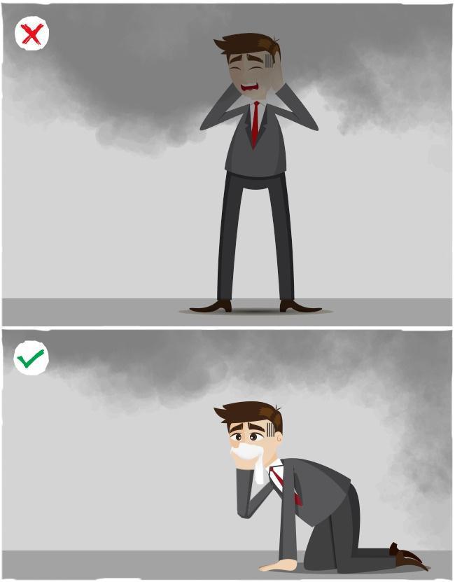 Οι ειδικοί τονίζουν ότι τα περισσότεροι σοβαροί τραυματισμοί κατά τη διάρκεια πυρκαγιάς προκαλούνται από εισπνοή μονοξειδίου του άνθρακα, και όχι τόσο από εγκαύματα. Αποφύγετε τους τοξικούς καπνούς, παραμένοντας κοντά στο πάτωμα, καθώς οι καπνοί ανεβαίνουν ψηλά, και βρείτε την πιο κοντινή έξοδο.