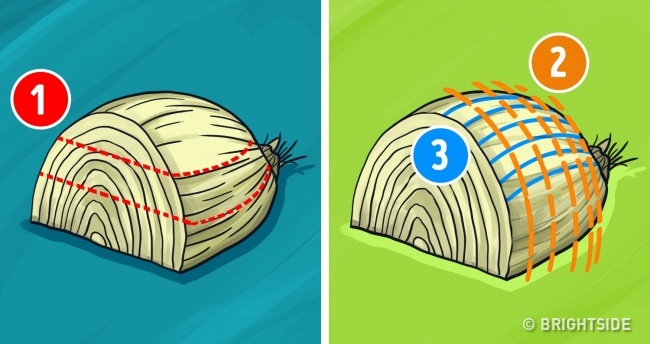 7. Η κοπή ενός κρεμμυδιού μπορεί να είναι απλή αν χωρίσετε το κρεμμύδι πρώτα στα δύο, κόψτε την άκρη και τη ρίζα, κάντε μερικές οριζόντιες χαρακιές και μερικές κάθετες. Η ποσότητα των τεμαχίων εξαρτάται από το επιθυμητό μέγεθος των κύβων. Και τέλος, κόψτε το κρεμμύδι σταυροειδώς.