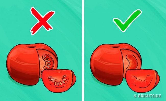 16. Εάν θέλετε να κόψετε μια ντομάτα χωρίς να αφήσετε τους χυμούς της να χυθούν, κόψτε την αυστηρά κατά μήκος της επιφάνειας της ντομάτας: υπάρχουν εσωτερικές φλέβες που χωρίζουν τους σπόρους από τα τοιχώματα της τομάτας.