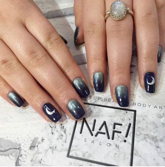 – Boho blue: Αυτή η εμφάνιση boho επιτεύχθηκε με μπλε βάση Ombre, lευκό βερνίκι και ένα στένσιλ.