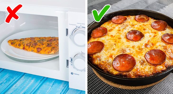 - Είναι δύσκολο να φανταστεί κανείς ένα πιάτο πιο άνοστο από μια πίτσα που έχει ζεσταθεί στον φούρνο μικροκυμάτων. Οι τραγανές άκρες μετατρέπονται σε κάτι υγρό και κολλώδες, και το τυρί γίνεται σκληρό σαν μπετό και έχει υφή καουτσούκ. Δεν υπάρχει τίποτα επιβλαβές σε αυτό το φαγητό, αλλά δεν θα πάρετε καμία ευχαρίστηση ενώ το τρώτε. Είναι καλύτερα να ξαναζεστάνετε το πιάτο σε ένα ζεστό τηγάνι ή στο φούρνο σε υψηλή θερμοκρασία.