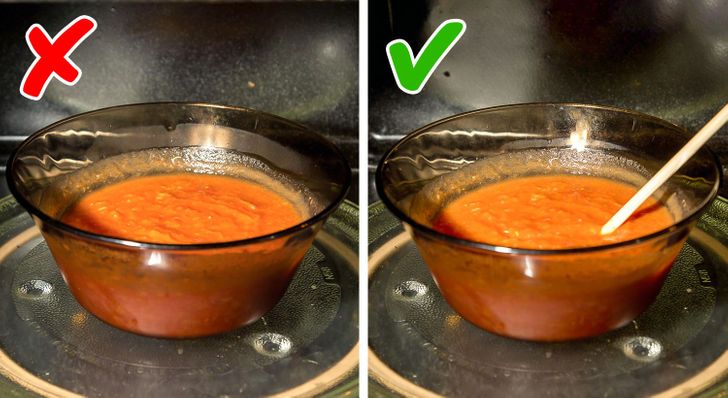 - Η νερουλή σούπα μπορεί να ζεσταθεί στον φούρνο μικροκυμάτων χωρίς να δημιουργήσει προβλήματα. Ωστόσο, η παχύρευστη σούπα , τύπου πουρέ, είναι μια εντελώς άλλη ιστορία. Μετά από λίγο, το πιάτο θα αρχίσει να εκρήγνυται με πυροτεχνήματα από σταγόνες σούπας που θα απελευθερωθούν μέσα στη συσκευή. Αυτό συμβαίνει επειδή το υγρό στο θερμαίνεται ανομοιόμορφα. Για να αποφύγετε αυτό το αποτέλεσμα, ανακατέψετε τη σούπα κάθε λεπτό. Μπορείτε επίσης να βάλετε ένα ξύλινο κουτάλι ή ένα ξυλαράκι στο μπολ με τη σούπα.
