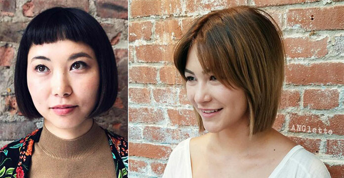 Κοντό καρέ κούρεμα με αφέλειες: Κλασσικό blunt bob κούρεμα με το ίσιο τελείωμα δείχνει εκπληκτικό και με αφέλειες. οι curtain bangs είναι ιδανικές για να καμουφλάρουν ένα μεγάλο κούτελο.