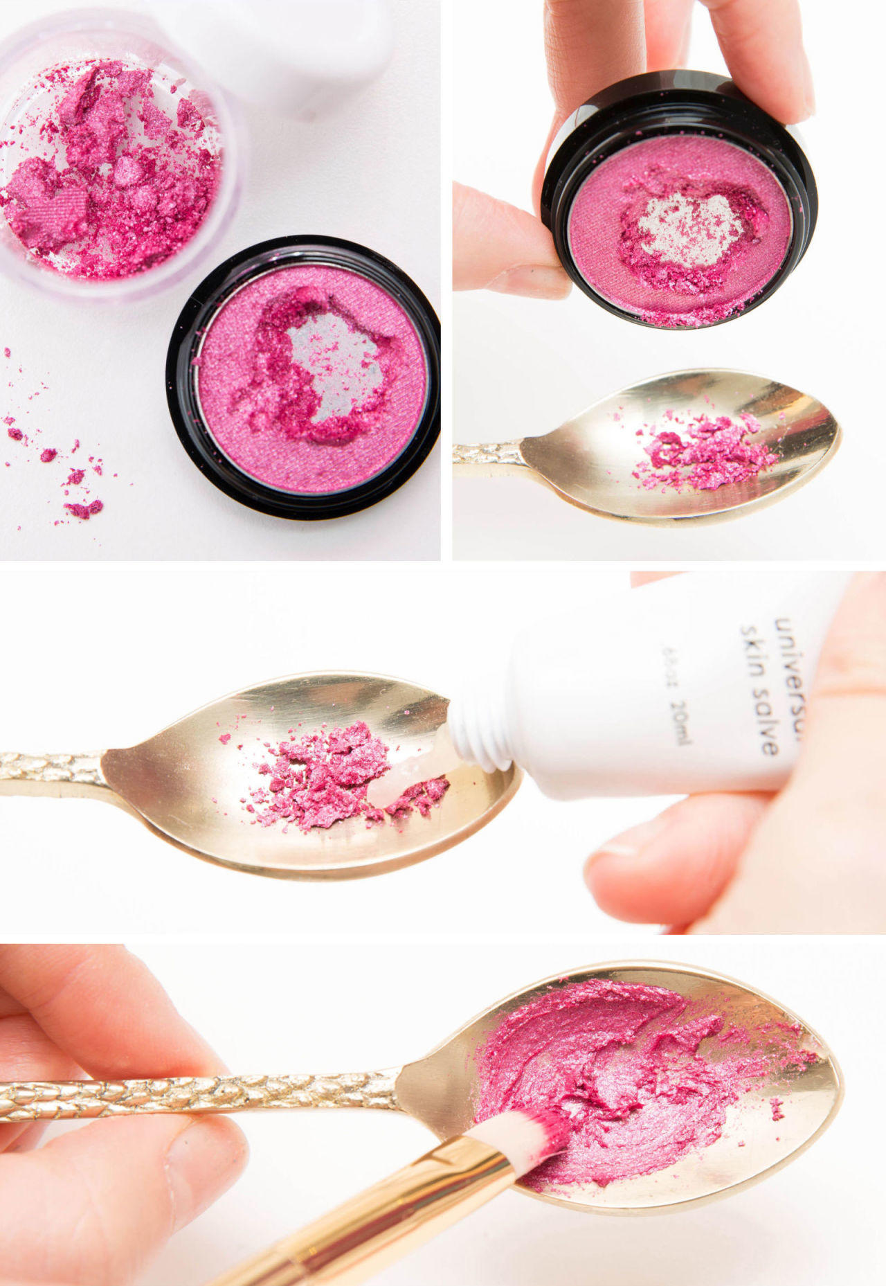– Επιδιορθώστε μια σκιά που έχει σπάσει ή άλλη συμπιεσμένη πούδρα με καθαρό οινόπνευμα. Ρίξτε λίγο οινόπνευμα μέχρι να γίνει μια πάστα. Πιέστε με ένα κουτάλι. Μόλις το οινόπνευμα εξατμιστεί, θα είναι έτοιμο για χρήση.