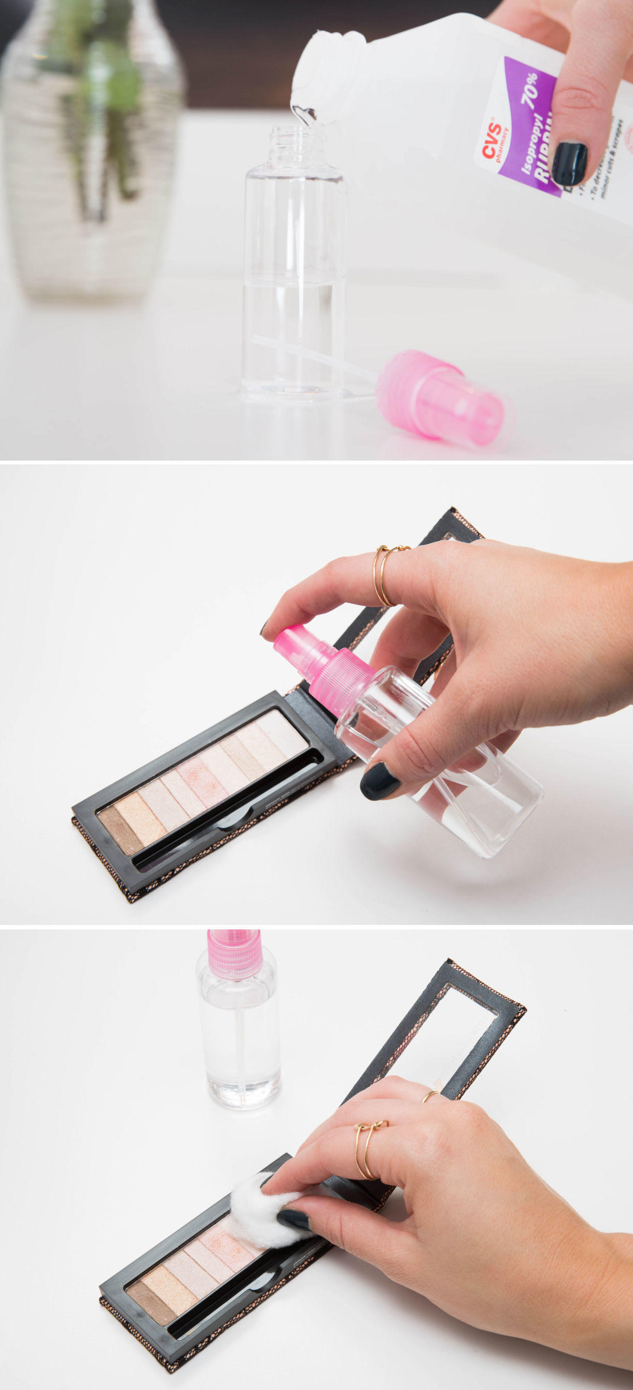 – Καθαρίστε τη παλέτα σκιών με λίγο βαμβάκι και καθαρό οινόπνευμα. Ρίξτε λίγο οινόπνευμα σε σπρέι και ψεκάστε τις σκιές. Θα ανανεωθεί το χρώμα και θα απολυμάνει τις σκιές.