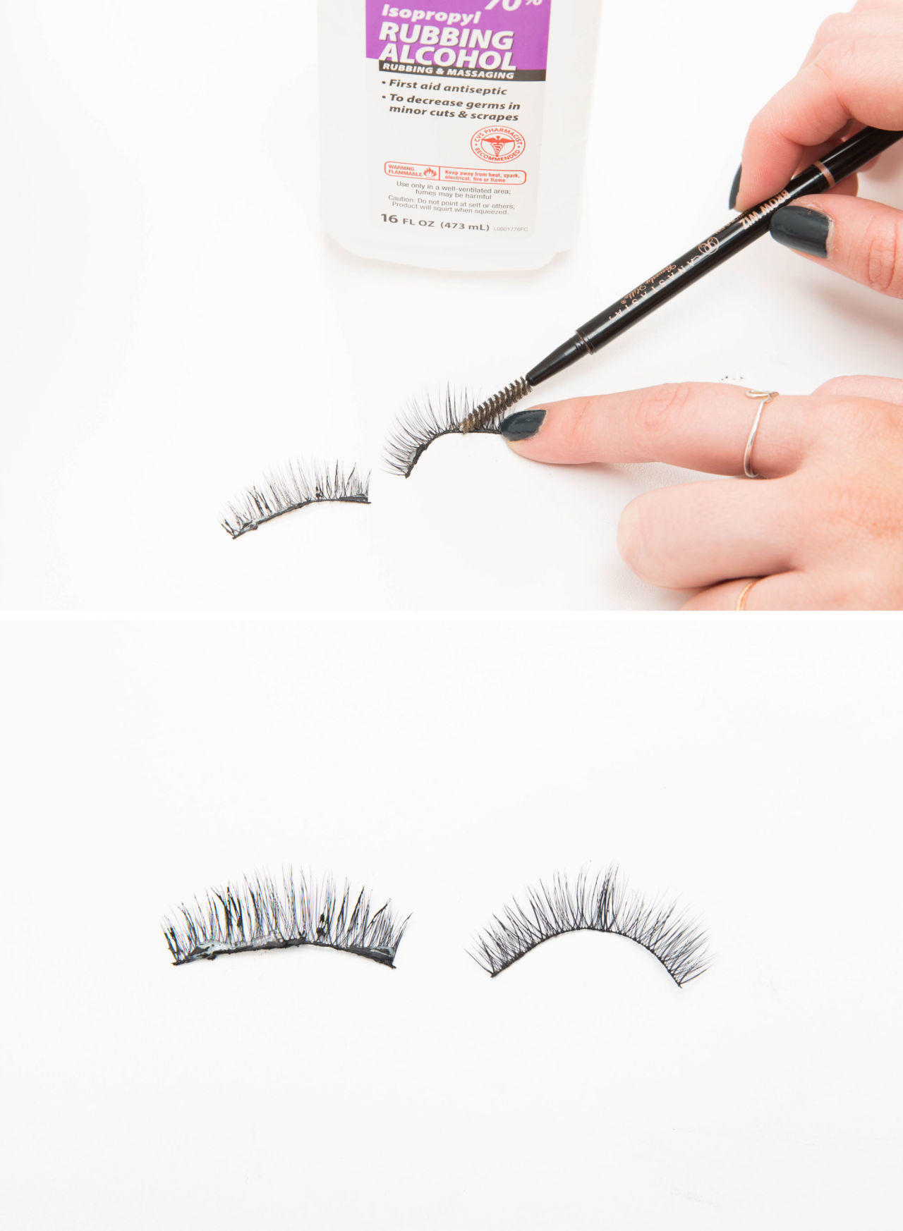 – Καθαρίστε μακιγιάζ και υπολείμματα κόλλας από ψεύτικες βλεφαρίδες με βουρτσάκι βλεφαρίδων και οινόπνευμα.