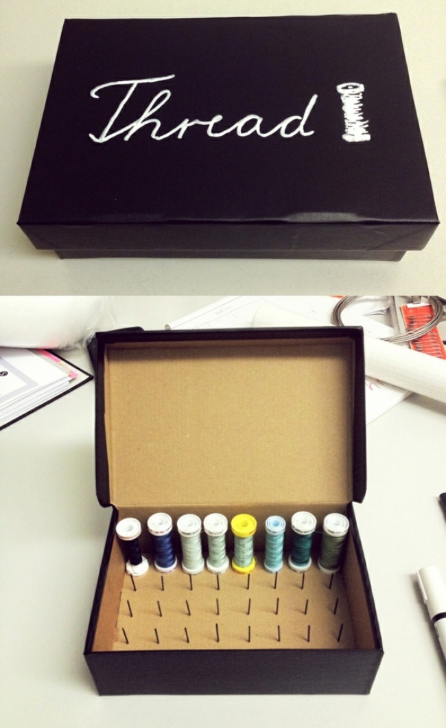 Δημιουργήστε ένα κουτί αποθήκευσης καρουλιών νήματος, χρησιμοποιώντας ένα κουτί παπουτσιών και μερικά μικρά καρφιά. Δεν θα χρειαστεί να ψάξετε ξανά τα μασουράκια σας!